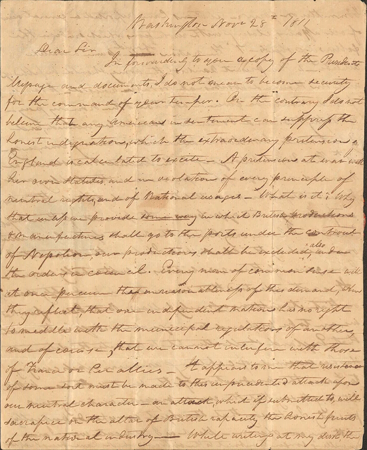 - 1811 letter from U.S. Congressman William Wyatt Bibb regarding the deteriorating relations between the United States and England, which would ultimately lead to the outbreak of the War of 1812. Accessed October 1, 2025. https://digitalcollections.samford.edu/Documents/Detail/1811-letter-from-u.s.-congressman-william-wyatt-bibb-regarding-the-deteriorating-relations-between-the-united-states-and-england-which-would-ultimately-lead-to-the-outbreak-of-the-war-of-1812/54712?item=54713